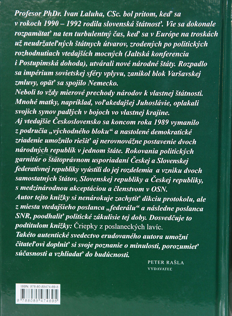 “Autor tejto knižky si nenárokuje zachytiť dikciu protokolu, ale z miesta vtedajšieho poslanca “federálu” a následne poslanca SNR, poodhaliť politické zákulisie tej doby”. Dosvedčuje to podtitulom knižky: Čriepky z poslaneckýc lavíc. Takéto auttentické svedectvo erudovaného autora umožní čitateľovi doplniť si svoje poznanie o minulosti, porozumieť súčasnosti a vzhliadať do budúcnosti.” (Vydavateľ Peter Rašla)